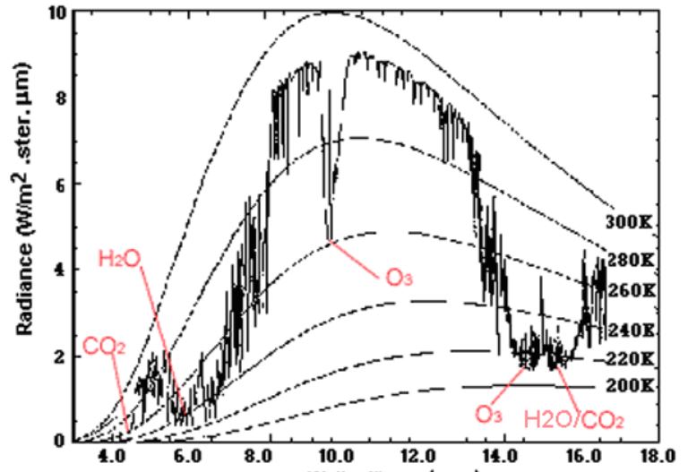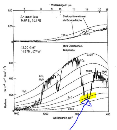 Aiemmin sanottuun liittyen korostettakoon vielä kerran, että hiilidioksidin säteily alkaa vasta 10 kilometrin korkeudessa, jossa sen lämpötila on – 53 Celsiusastetta. Vesihöyryn säteily onnistuu noin neljän kilometrin korkeudessa ja otsoni puolestaan säteilee stratosfäärissä, noin 50 kilometrin korkeudessa.