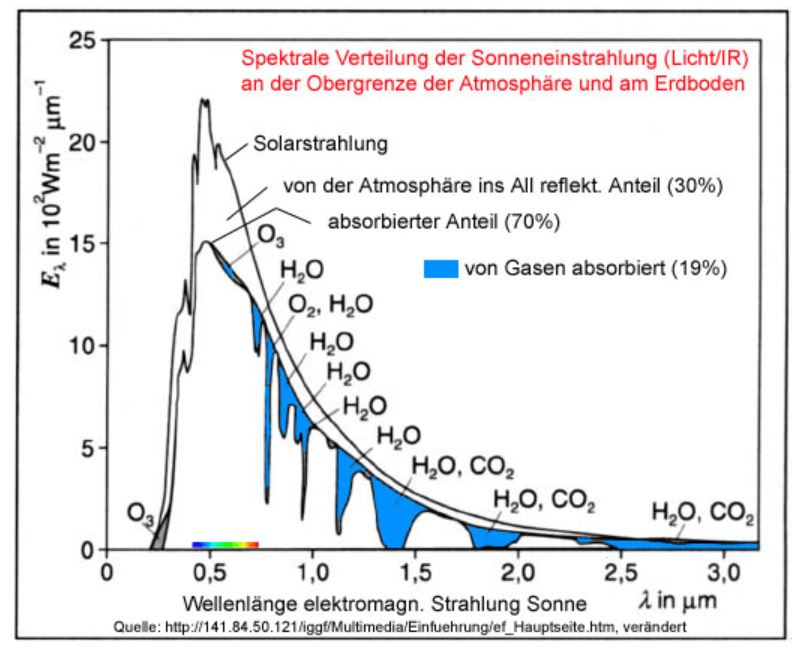 Kuvassa vasemmalla alhaalla on näkyvän valon spektrin edustama osa kokonaissäteilystä. Käyrän korkeus kuvaa säteilyn voimakkuutta. Sinisellä merkityt alueen kuvaavat niitä alueita, joilla kaasut absorboivat tulevaa säteilyä. Yläilmakehässä O3 on otsoni, joka leikkaa auringon UV-säteilystä suurimman osan ja estää sen pääsyn maatasolle. Näkyvän valon taajuudella hiilidioksidi CO2 ei absorboi energiaa lainkaan. Vesihöyry H2O kattaa käytännössä lähes koko spektrin eli absorboi säteilyenergiaa laaja-alaisesti.