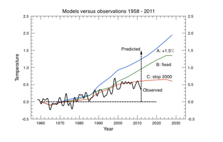 Musta käyrä kuvaa ilmakehän lämpökehitystä. Hansenin erehdys on luokkaa 150 prosenttia. Tällaisella ennustetarkkuudella ei ole aivan yksinkertaista puhua luonnontieteen saavutuksista tai ennustemallien luotettavuudesta.