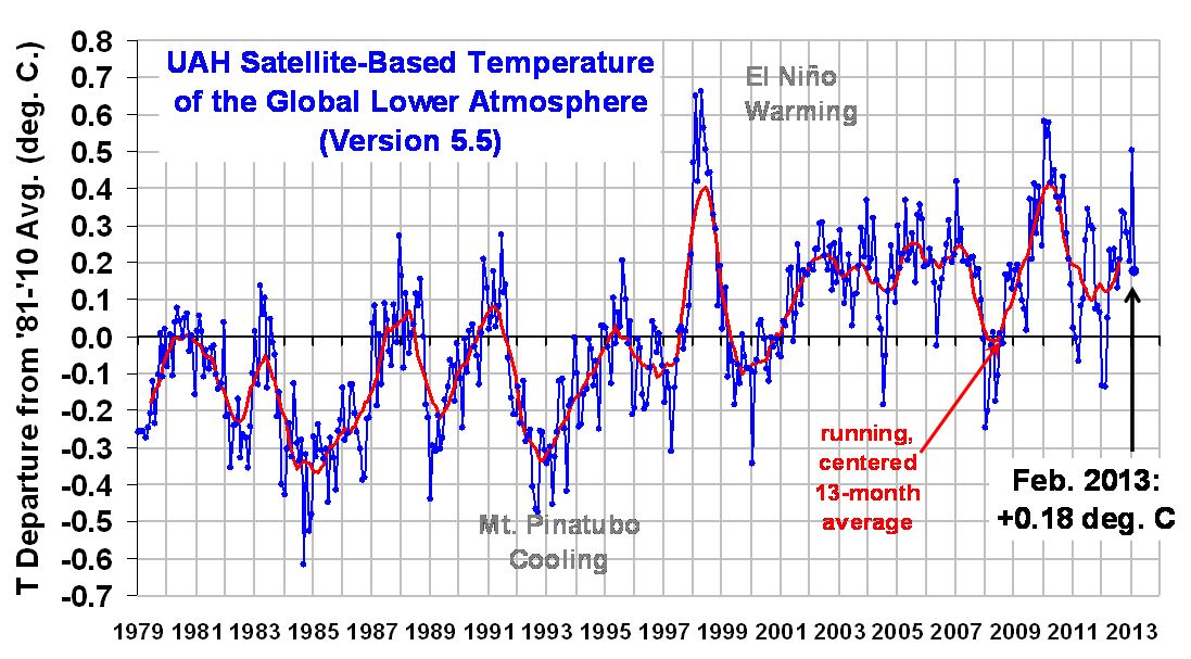 Satelliittiajan lämpötilan heilahtelu näkyy havainnollisesti oheisessa Roy Spencerin käyrässä. Tilanne maaliskuussa 2013:
