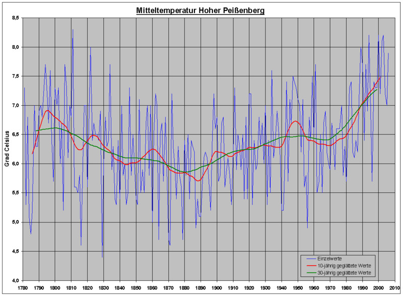 Välipalaksi syksyn harmauteen lämpenemiskäyrä maailman vanhimmalta vuoristo-observatoriolta. Se sijaitsee Baijerissa ja on nimeltään Hoher Peissenberg (Hohenpeissenberg). Havainnot ovat jatkuneet lähes yhtäjaksoisesti 1700-luvulta lähtien. Observatorio sijaitsee pienellä, noin 900 metriä korkealla vuorella pienen maaseutukaupungin kupeessa. Ilma on puhdas eikä kaupunkiefekti pääse lämpötilan seurantaa häiritsemään.